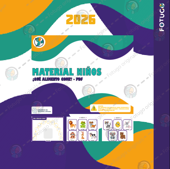 Incluye 1 tablero con distintos alimentos para colorear y 11 tarjetas con animales, que los niños deben ubicar en el tablero y relacionar con su alimento correspondiente, coloreándolo según la indicación.